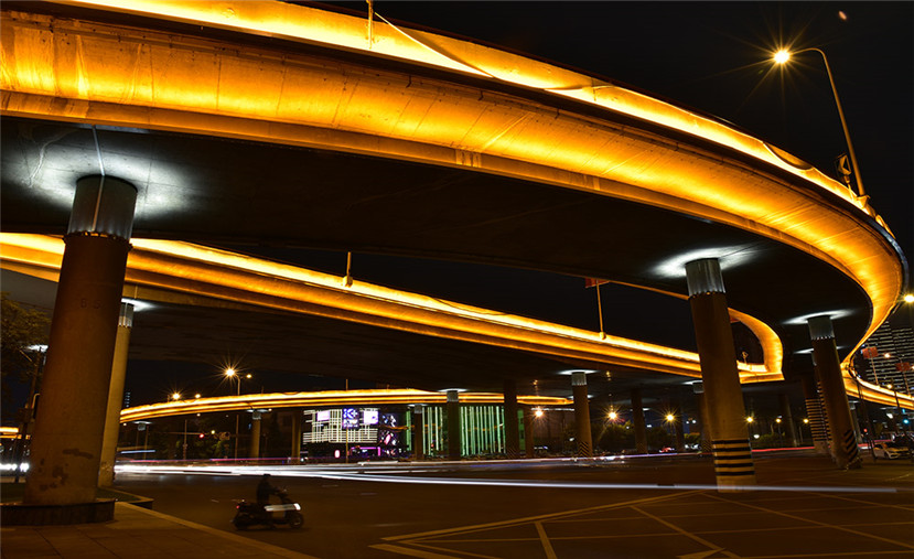 橋側(cè)和橋腹,分別通過線型投光燈和線型洗墻燈照亮的方式,采用連續(xù)暖色調(diào)的有色光以表現(xiàn)立交橋夜間的建筑美,使立交顯得更輕盈。